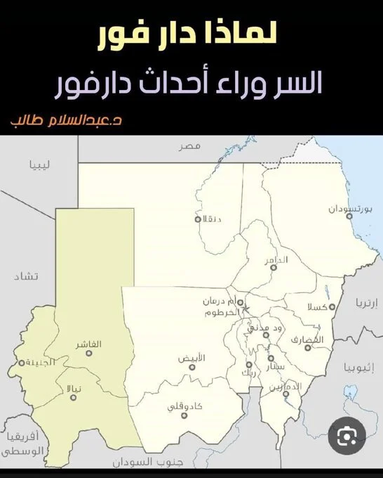 ستقرأ معلومات ربما لم تسمعها من قبل ...! سميت دارفور من "دار الفور"، وهي تعني "أرض الفور". الفور هي قبيلة كبيرة حكمت سلطنة دارفور الإسلامية في المنطقة. دار فور تعادل ثلث مساحة السودان وبمساحة 511 ألف كيلو متر أي تعادل مساحة فرنسا وتعتبر أغنى بقعة على وجه الأرض وكان الصراع عليها قديما وكان والي دارفور زمن الحكم العثماني يتولى رعاية مكة والكعبة وآبار علي نسبة لعلي بن دينار السوداني 1898 م ما لا يعلمه العرب عن دار فور :