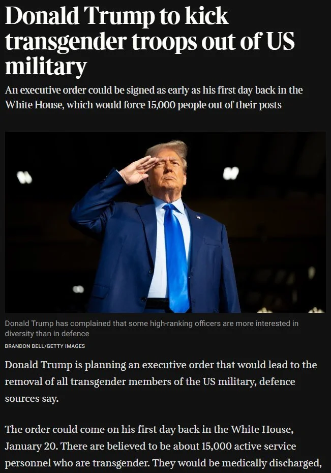 ترامب يخطط لإصدار أمر تنفيذي بطرد الشواذ من الجيش الأمريكي لحظة توليه منصب الرئيس يوم 20 يناير القادم وذلك بإعداد تقارير تفيد بأنهم غير مؤهلين طبياً مما يعني عدم كفائتهم للخدمة العسكرية وكذلك حظر كل شاذ من التقدم للعمل في القوات المسلحة. وقد انتقدهم ترامب سابقاً ولمّح بأن الجنود الشواذ غير قادرين على القتال في ساحات المعارك وأن الإداريين الشواذ العاملين في القوات المسلحة يقضون وقتهم في مواضيع الشذوذ وقضايا أخرى مثل التحيز والتمييز والعنصرية ويتركون الأمور الأهم التي تم توظيفهم على أساسها. وقال مؤيدو الشواذ بأن هذا القرار إن حدث فسيكون كارثي لأنه سيتم تسريح 15,000 شخص دفعة واحدة.